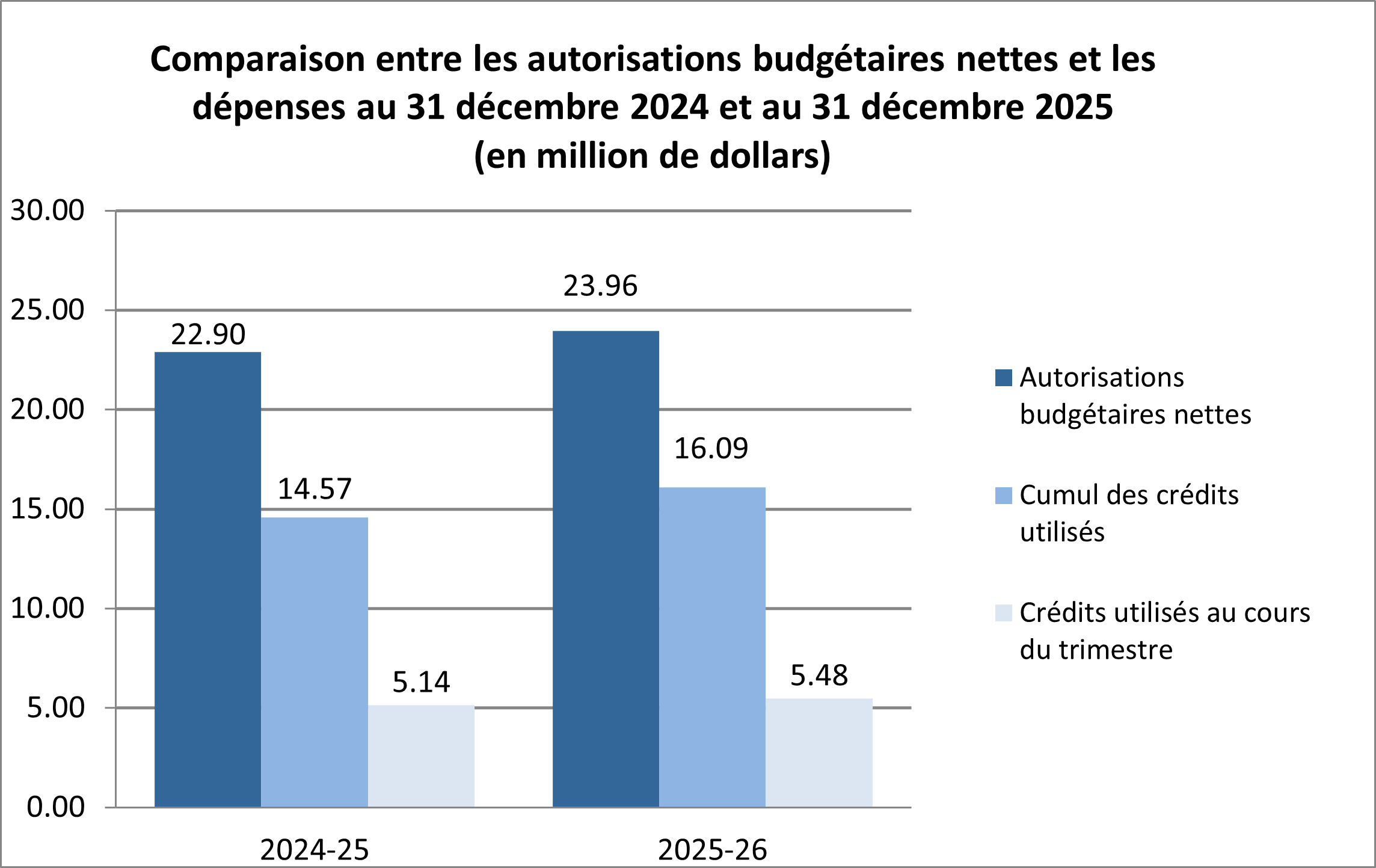 Au 31 décembre 2025, le total des autorisations disponibles (c.-à-d. le budget) en fin de trimestre avait augmenté de 1,06 M$ (une augmentation de 4,6 %) par rapport à celui disponible à la fin du même trimestre de l’exercice précédent, passant de 22,90 M$ en 2024 2025 à 23,96 M$ en 2025 2026. Une grande partie de cette augmentation est attribuable au financement reçu pour les conventions collectives récemment signées, ainsi qu’aux fonds reportés provenant du budget de fonctionnement de l'exercice précédent du Tribunal.